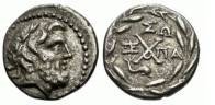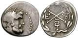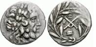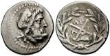 | Lacedaemon Clerk 321 | Achaean League, Lacedaemon. Circa 192 BC. AR Hemidrachm. Laureate head of Zeus Amarios right / AX monogram, caps of Dioskuri to left and right, I over Λ above, EY below; all within wreath. | Text | ![]() |