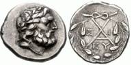 | Messene BMC 118 | Messene AR Hemidrachm. 196-146 BC. Laureate head of Zeus right / AX monogram, O-N to left and right, OP above, M below; all within laurel-wreath. Agrinion 325d-e. | Text | ![]() |