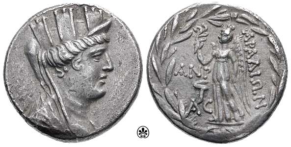 BMC 212 | Arados, Phoenicia. Year 164 = 96-95 BC. AR Tetradrachm. Turreted and draped bust of Tyche right / Nike walking left, holding aphlastron and palm-branch, date ΔΞP, Phoenician B and ΘC in left field, all within wreath. Duyrat 3249-3261; BMC 212; AUB Beirut 86-87; Ashmolean 1; ANS 1984.65.118. | Text | Image |