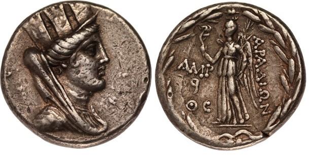 BMC 276 | Arados, Phoenicia. AR tetradrachm, Dated local year 196, 64-63 BC. 26 mm, 15.5 g. Turreted, veiled and draped bust of Tyche right. / AΡAΔIΩN, Nike standing left, holding aphlaston and palm branch. ς retrograde P P over Phoenician letter Q over AΣ in left field, all within wreath. BMC 276; Duyrat 3999-4034; Babelon 1109; Boston MFA 2199; AUB Beirut 130. | Text | Image |