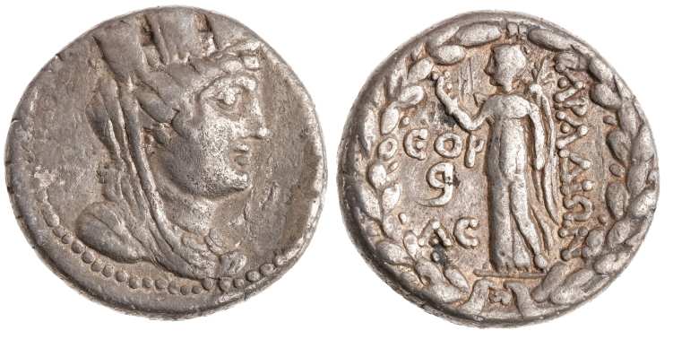 | BMC 212 | Arados, Phoenicia. Year 164 = 96-95 BC. AR Tetradrachm. Turreted and draped bust of Tyche right / Nike walking left, holding aphlastron and palm-branch, date ΔΞP, Phoenician B and ΘC in left field, all within wreath. Duyrat 3249-3261; BMC 212; AUB Beirut 86-87; Ashmolean 1; ANS 1984.65.118. | Text | Image |