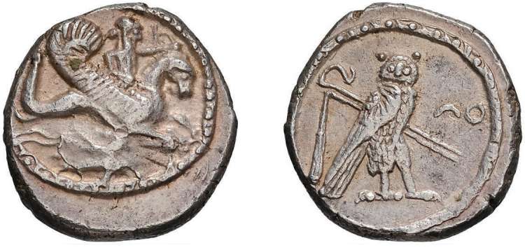 | Betlyon 37 | Phoenicia, Tyre, Uzzimilk. Circa 347-332 BC. AR Didrachm. Dated year 15 (332 BC). Crowned & bearded deity riding right on winged hippocamp, holding reins & bow; two-line zig-zag wave & dolphin right below / Owl standing right, head facing, crook & flail behind; Phoenician letter Ayin with date to right. | Text | Image |
