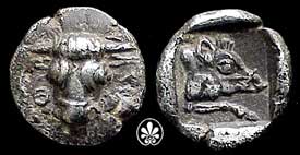 | BMC 56 | Phokis, Federal Coinage. 510-478 BC. AR Obol, 0.87 g. Bull's head right / Forepart of boar right in incuse square.