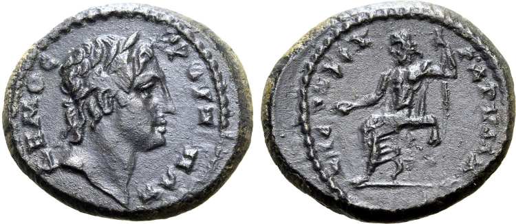 | BMC 1 | Bruzus, Phrygia, AE18 semi-autonomous issue, AD 117-138. Magistrate Roufeinos Drumikos. 3.9 g. ΔHMOC BΡOYZHNΩN, laureate head of Demos right. / Ρ ΔΡYMIKOC ANEΘHKEN, Zeus seated left, naked to waist, himation over lower limbs, holding patera and sceptre. BMC 1; Imhoof KM 1; Waddington Coll. 5757 corr (magistrate's name); Kurth Demos 283; Martin, Demos 1. | Text |  |