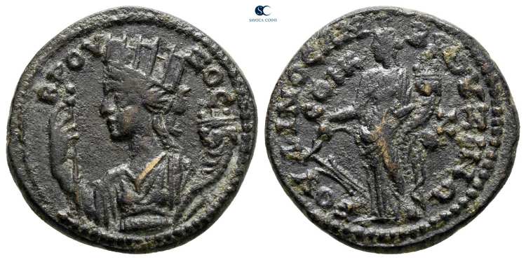 | BMC 2 | Bruzus, Phrygia, AE21. Semi-autonomous issue, AD 193-217. 4.5g. BΡOY-ZOC, half-length figure of Tyche left, turreted, holding sceptre in raised right hand and cornucopiae in left. / ΡOYΦINOC BΡOYZHNΩN around, ANEΘHK in fields; Tyche standing left, holding rudder and cornucopiae. BMC 2; SNG Cop 225; SNG Munich 164. | Text |  |