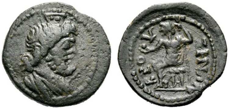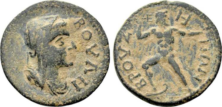 | BMC 12 | Julia Domna, AE23 of Bruzos, Phrygia. AD 193-217. 4.41 g. IOYΛIA CEBACTH, draped bust right. / BΡOYZHNΩN, Poseidon standing left, looking right, foot on prow, wielding trident. BMC 12; Imhoof KM 3; Whittall 740 (part). | Text |  |