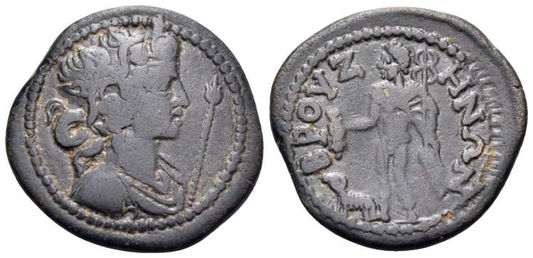 | BMC 14 | Plautilla AE21 of Bruzos, Phrygia. AD 202-205. 4.43 g. ΠΛAYTIΛA CEBACTH, draped bust right. / BΡOYZHNΩN, Dionysos standing left, wearing long robe, holding kantharos and thyrsos. BMC 14; Lindgren III 566; Kurth Dionysos 946; Bernhart 453. | Text |  |