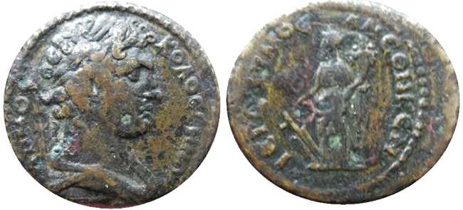 | Gazdac 63 | Antoninus Pius AE18 of Colossae, Phrygia. AD 138–161. 2.5 g. Obv. legend worn, laureate head right. / KOΛOCCHNΩN, wolf standing right. Gazdac Apulum 63; Alba Julia museum inv. 3484. | Text |  |