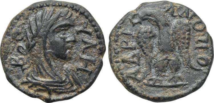 | Leypold 1554 | Caracalla AE32 of Hadrianopolis-Sebaste, Phrygia. AD 198-217. 22,29 g. Magistrate Kallikrates. AY K M AYΡ ANTωNINOC CEB, laureate head right. / CEB AΔΡIANOΠO EΠI AΡX KAΛΛIKΡATOY CB, Tyche standing left, holding rudder and cornucopiae. SNG Leypold 1554; Imhoof GM 686 corr. (magistrate's name misspelled); Arslan (1990), 28. | Text | Image |