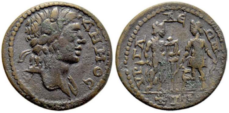 | BMC 3 | Hyrgalis, Phrygia. AE28 semi-autonomous issue. AD 221-222. Dated local year 306. ΔHMOC, laureate, draped bust of Demos right. / YΡΓAΛEΩN TO TC, Apollo standing right, holding bow, lyre on a tripod before him, facing Artemis standing left, holding bow and arrow, stag at foot left. BMC 3; Waddington 6199; Aulock Phrygien I 347-348; Kurth Demos 346. | Text | Image |