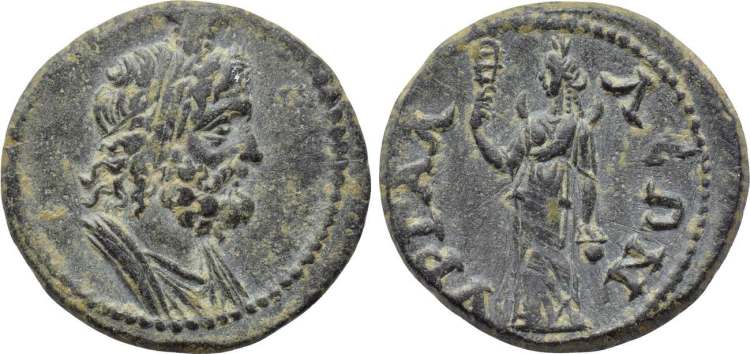 | BMC 12 | Severus Alexander, AE26 of Hyrgaleis, Phrygia. AD 222-235. 8.63 g. Dated local year 306 (AD 222). M AYΡ AΛEXANΔΡOC AYΓ (YΓ ligate), laureate, draped and cuirassed bust right. / YΡΓAΛEΩN TO TC, Tyche standing left, holding rudder and cornucopiae. BMC 12; Von Aulock, Phrygiens I 379-384; Imhoof GM 709. | Text | Image |