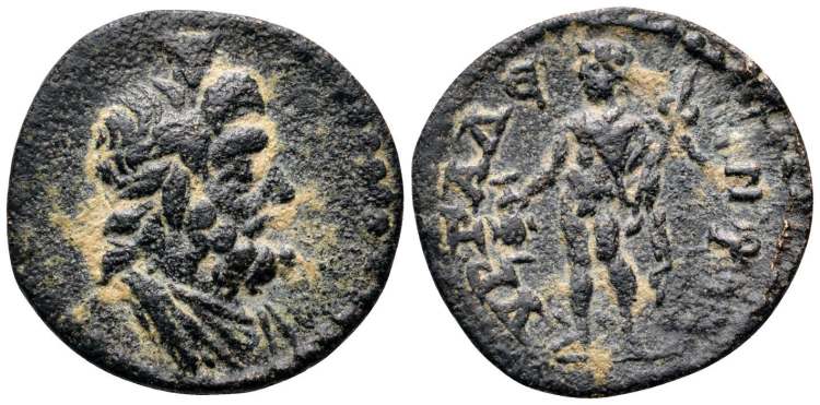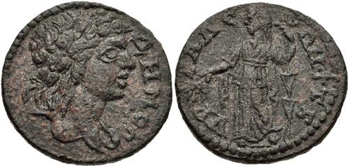 | Righetti V 520 | Geta, AE20 of Hyrgaleis, Phrygia. AD 198-209. 4.21 g. Π ΓETAC KAICAΡ, laureate, draped and cuirassed bust left. / YΡΓA-ΛEΩN, draped bust of Mên right, wearing Phrygian cap, crescent on shoulders. Righetti Sale V, 520. Unpublished. | Text | Image |