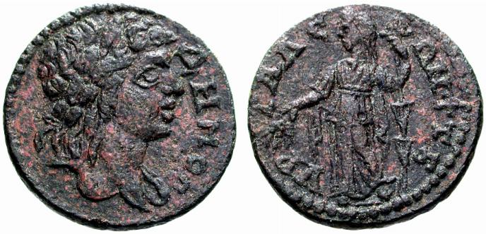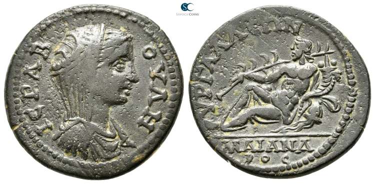 | BMC 8 | Julia Domna, AE31 of Hyrgaleis, Phrygia. AD 193-217. Magistrate Julius Adrastos. 17.3 g. IOYΛIA ΔOMNA CEBACT, draped bust right. / EΠI IOYΛIOY AΔΡACTOY AΡXO YΡΓAΛΛEΩN, Kybele seated left, holding patera, resting left arm on tympanum, lion at her side. BMC 8 (this coin); Aulock Phrygien I 364. | Text | Image |