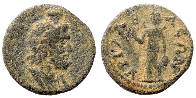 | BMC 6 | Hyrgaleis, Phrygia. AE20 semi-autonomous issue, AD 211-235. Draped bust of Serapis right, kalathos on head. / YΡΓAΛΛEΩN, Isis standing left, holding sistrum and situla; crescent on shoulder. SNG Cop 482; BMC 6; Aulock Phrygien I 335-338; Waddington 6197; SNG Munich 258. | Text | Image |