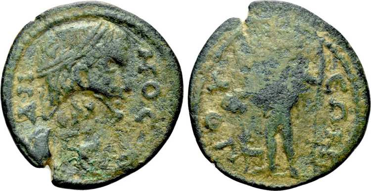 | Aulock Phryg. 416 | Marcus Aurelius, AE18 of Julia, Phrygia. AD 161-180. 3.42 g. AY KAI ANTΩNEINOC, laureate, draped and cuirassed bust right. / IOYΛIEΩN. Poseidon standing left, right foot on prow, holding dolphin and trident. Aulock Phrygien 1 416 corr. (obv legend and rev descr.); Vienna 19879. | Text | Image |