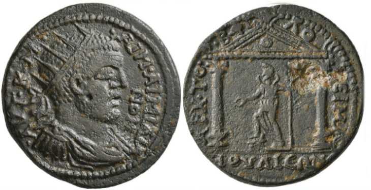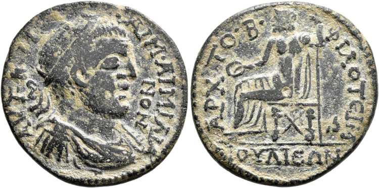 | RPC IX 894 | Aemilian, AE29 of Julia, Phrygia. AD 253. Magistrate Philoteimos. 11.5 g. AYT K M AIM AIMIΛIANON, radiate, draped and cuirassed bust right. / AΡX TO B ΦIΛOTEIMOY IOYΛIEΩN, Zeus seated left, holding patera and sceptre. Aulock Phrygien 1 436; Athens 5908A; RPC IX 894. | Text | Image |