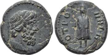 | BMC 5 | Julia Domna, AE23 of Otrus, Phrygia. AD 193-217. Magistrate Nigreinos. IOYΛIA ΔOMNA CEBAC, draped bust right. / EΠ NIΓΡEINOY OTΡOHNΩN AΡ-X, Zeus standing left, holding patera and sceptre, eagle left at foot. BMC 5; Aulock Phrygien I, 773-775; SNG Cop 631. | Text | Image |