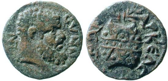 | BMC 28 | Synnada, Phrygia. AE31. Semi-autonomous (Claudius to Gallienus). 6.68 g. CVNNA-ΔE-ΩN to right, below and left of head of bearded Herakles right / IΩNΩN AΡ KEΛCO TΓ around prize crown with 2 palm branches. BMC 28; Imhoof-Blumer KM 30; Waddington 6527-8. | Text | Image |