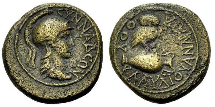 | BMC 10 | Synnada, Phrygia, AE19, Time of Claudius. 41-54 AD. CVNNAΔEΩN, helmeted bust of Athena right / KΛAYΔIOY ANΔΡAΓATOY, Owl on amphora right. RPC I 3186; BMC 10; Waddington 6522; Imhoof KM 12; Weber 3610. | Text | Image |