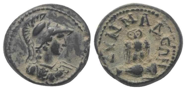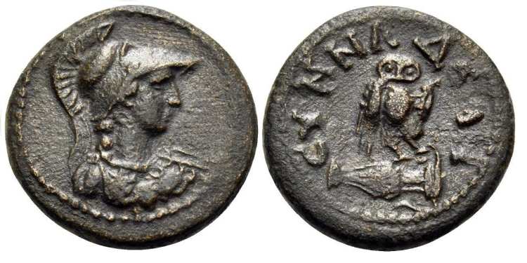 | Mionnet IV, 966 | Synnada, Phrygia. AE17, civic issue. 133-1 BC. Magistrate Admetos. 4.05 g. Helmeted head of Athena right. / ΣYNNA AΔMH, owl standing right, head facing, on overturned amphora. Mionnet IV, 966; SNG Cop 709; SNG Munich 462. | Text | Image |