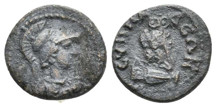 | Imhoof GRM 1 | Synnada, Phrygia. AE16, semi-autonomous issue. AD 100-200. 3.17 g. CYNNAΔEΩN, helmeted head of Athena right, with aegis. / No legend, owl standing right on amphora, head facing, between a poppy on the left and a corn-ear on the right. Imhoof GRM 1 in RSN XIV. | Text | Image |