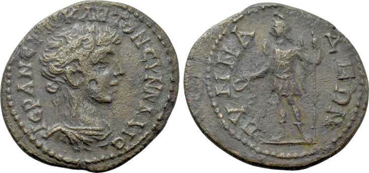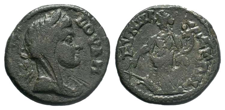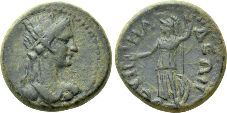 | RPC 1394 | Domitia, AE21 of Synnada, Phrygia. ΔOMITIA CEBACTH, draped bust right / CYNNAΔEΩN, Athena standing left, holding patera (or Nike?) and spear, shield at her side. BMC 40. | Text | Image |