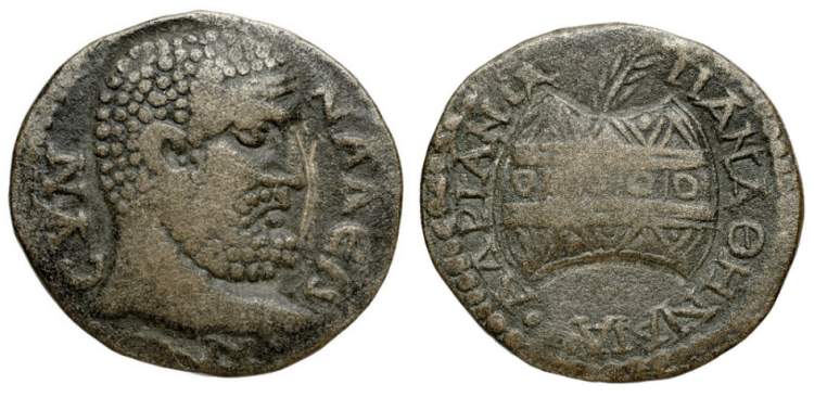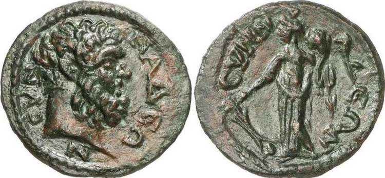 | Mionnet IV, 983 | Synnada, Phrygia. AE25. Semi-autonomous issue, AD 198-276. Hadriania-Panathenian Games issue. CYNNAΔEΩN, bearded head of Herakles right. / AΔΡIANA ΠANAΘHNAIA, prize urn containing one palm branch. Mionnet IV, 983 (this coin); Paris 2027; SNG Cop 718; SNG Tübingen 4197; Falghera 2976; RPC IX 886. | Text | Image |