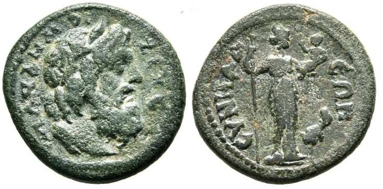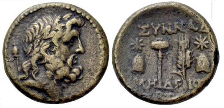 | SNG Cop 705 | Synnada, Phrygia. AE21 AE Civic issue, magistrate Hierokles. 133-1 BC. Turreted and draped bust of Tyche right. / CYNNAΔE IEΡOKΛE, Zeus standing left, holding thunderbolt and sceptre. SNG Cop 705; Vienna 31388; SNG von Aulock 8445; SNG Tuebingen 4195. | Text | Image |
