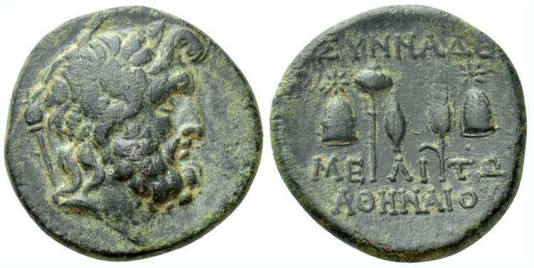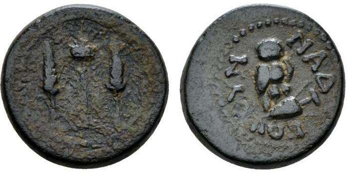 | SNG Cop 708 | Synnada, Phrygia. AE22, Circa 133-1 BC. 7.57 g. Magistrate Meliton, son of Athenaios. Laureate head of Zeus right. / ΣYNNAΔ MEΛITΩN AΘHNAIΩN, poppy and corn-ear between piloi of the Dioskuri, each with a star above. SNG Cop 708; Mionnet IV, 964. | Text | Image |