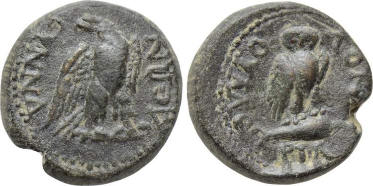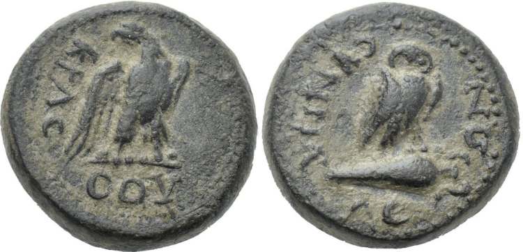 | RPC 3184 | Synnada, Phrygia. AE15, semi-autonomous issue. ca. AD 14-37. Magistrate Krassos. KΡACCOY, eagle standing right, head left, wings slightly open. / CYNNAΔEΩN, owl standing right on amphora, head facing. RPC I 3184; Duesseldorf 10467; Paris 2013; Weber 7182; Imhoof GM 742a. | Text | Image |
