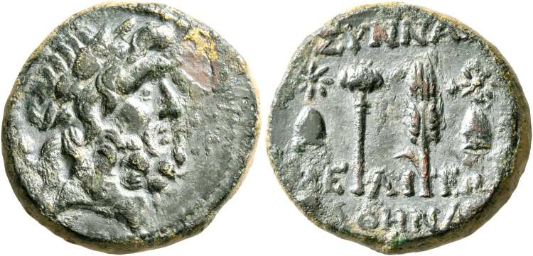 | Winterthur 4225 | Synnada, Phrygia. AE23. 133-1 BC. Magistrate Medios Artemi.. 8.24 g. Laureate head of Zeus right, sceptre behind head. / ΣYNNAΔE MHΔEIOY AΡTEMI.. above and beneath poppy and corn-ear between two piloi, each with a star above. Winterthur 4225, Löbbecke 347-348 in ZfN 1885; SNG Turkey 11, 589; Çetin Erdem Inv. 1156. | Text | Image |