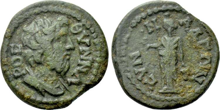 | RPC 3190 | Nero AE18 of Synnada, Phrygia. 4.1 g. NEΡΩN KAIΣAΡ ΣEBAΣTOΣ, bare head right. / TI K ΠICΩN ΦIΛOK CYNNAΔEΩN (anti-clockwise inwards from top left), Zeus seated left on stool, holding Nike and sceptre. RPC 3190; SNG Cop 726-727; SNG von Aulock 8449; Imhoof KM 13; Paris 2048-2049. | Text | Image |