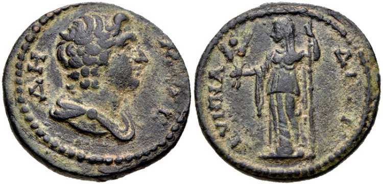 | BMC 51 | Lucilla, AE31 of Synnada, Phrygia. AD 164-169. Magistrate K Basilios. ΛOYKIΛΛA CEBACTH, draped bust right / EΠI IEΡI K BACIΛOYC CYNNAΔEΩN, Cult image of Artemis Ephesia standing front between two stags. BMC 51; SNG von Aulock 8450; SNG Munich 477; Weber 3613; SNG Righetti 1227; Imhoof KM 22. | Text | Image |