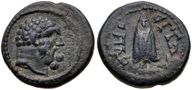 | RPC IV 4961 | Marcus Aurelius as Caesar, AE25 of Synaus, Phrygia. AD 139-161. Magistrate Apollophanes. M AYΡH OYHΡOC KAICAΡ, bare-headed, draped, cuirassed bust right / CTΡ AΠOΛΛΩΦANOYC B TO Δ CYNEITΩN, Dionysos, loins draped long, standing left, holding kantharos and thyrsos. RPC IV 4961 (online); den Haag; Istanbul; CNG auction 168, Lot 135. | Text | Image |