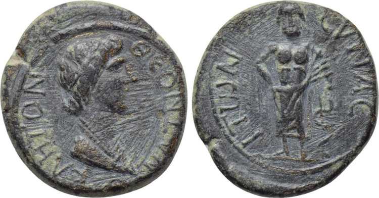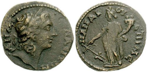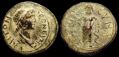 | RPC 3107 | Nero and Agrippina II, AE19 of Synaus, Phrygia. 54-59 AD. NEΡΩN ΘEOC AΓΡIΠΠEINA ΘEAEA, draped bust of Agrippina right, facing bare head of Nero left / CYNAEITΩN EΠI MHTΡOΦANOYC, Apollo, naked, standing right, holding bow. SNG Righetti 1223; RPC I 3107; BMC 13-14; SNG von Aulock 3966; Waddington 6514; SNG Cop 702; Imhoof MG 156. | Text | Image |