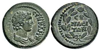 | SNG vA 3969 | Faustina II, AE20 of Synaus, Phrygia. AD 146-180. ΦAYCTINA CEBACCTH (sic), draped bust right. / CYNAEITΩN, Zeus standing left, holding eagle and sceptre. SNG von Aulock 3969; SNG Cop 704. | Text | Image |