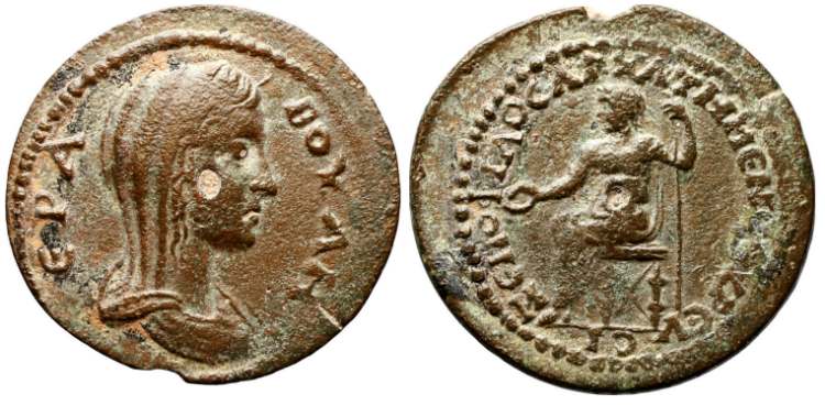 BMC 9 | Temenothyrae, Phrygia. AE29, semi-autonomous issue, AD 238-244. Magistrate Zenophilos. 9.15 g. IEΡA BOYΛH, draped and veiled bust of Boule right. / XENOΦIΛOC AΡX A THMENOΘYΡEYCI, Zeus seated left, holding patera and sceptre. BMC 9 (this coin); Paris 2106; Waddington 5317; Weber 7192; Mionnet IV, 839; SNG Righetti 1230; SNG Cop 739 corr. (obv. legend). | Text | Image |