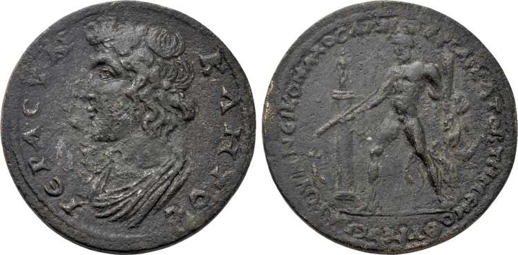 BMC 12 | Temenothyrae, Phrygia. AE43, semi-autonomous issue, AD 244-249. Magistrate Aroun Neikomachos. 40.77 g. IEΡA CYNKΛHTOC, draped bust of the Senate left. / AΡOYN NEIKOMAXOC AΡXIEΡEYC AΡX A TO B THMENOΘΡEYCI, Herakles, naked, standing left, holding torch and club and with lionskin over left arm, pointing the torch at a small Eros (often mistaken for the Hydra) at lower left. In the background to left is a tall column surmounted by a statue of Athena. BMC 12; Hunter 1-2; Kurth Herakles 206. | Text | Image |