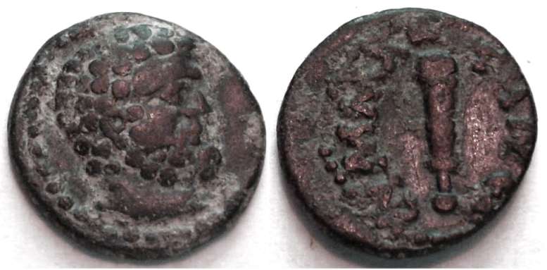 Imhoof KM 1 | Temenothyrae, Phrygia. AE. 202-205 AD. Bearded head of Herakles right / (from top right) CYMMAΣ THMEN, club. Imhoof KM 1. | Text | Image |