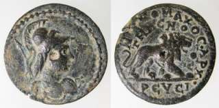 BMC 16 | Phrygia, Themenothyrae, 20mm, 3.93g. helmeted bust of Athena right, spear over shoulder, wearing crested Corinthian helmet and aegis / NEIKOMAXOC AΡX ΘEMENOΘYEΡYCI, lion walking right. SNG von Aulock 4003; BMC 16; SNG Cop 740; Walcher 2712. | Text | Image |