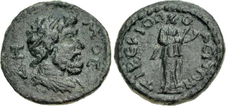 | BMC 11 | Hadrian, AE20 of Tiberiopolis, Phrygia. AD 117-138. Magistrate Sosthenos. AYT K AΔΡIAN, laureate, draped bust right / EΠI ΣΩΣΘENOYΣ AΡ around, TIB-EΡI in fields, Zeus standing left, holding patera and sceptre. BMC 11; Aulock Phrygien II 1249-1251; Imhoof MG 163; Lindgren I 1046; RPC III, 2517. | Text | Image |