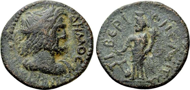 | RPC 2516 | Hadrian, AE24 of Tiberiopolis, Phrygia. Magistrate Ail. Flav. Sosthenes. AD 117-138. 12.96 g. AYT KAI AΔΡIANOC, laureate, cuirassed bust right with aegis on shoulder / EΠI T AIΛI CΩCΘEN TIBEΡIOΠ, Apollo standing left, holding laurel branch and leaning left arm on a column. RPC III 2516; Paris 2168. | Text | Image |