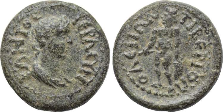 | RPC 2515 corr | Hadrian, AE17 of Tiberiopolis, Phrygia. Magistrate Sosthenes. AD 117-138. 2.46 g. AYTOK TΡAI AΔΡIANOC, radiate head right / EΠI CΩCΘENOY TIBEΡIO, Apollo standing left, holding laurel branch and resting left hand on lyre at foot right. RPC III 2515 corr.(rev legend); Paris 2169. | Text | Image |