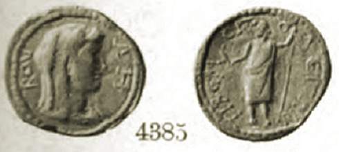 | Waddington 6577 | Sabina, AE19 of Tiberiopolis, Phrygia. CABEIN CEBACT, diademed, draped bust right. / TIBEΡIOΠO, Artemis standing right, holding bow and drawing arrow from quiver at shoulder, stag at foot to right. Waddington 6577; Paris 2171; SNG Munich 500; RPC III 2519. | Text | Image |