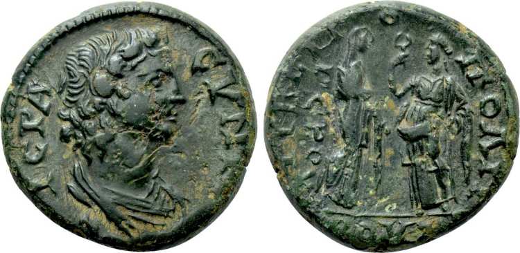 | Aulock Phryg. II 1293 | Caracalla, AE30 of Tiberiopolis, Phrygia. AD 198-217. 12.57 g. AYT KAI M AYΡ ANTωNEINOC, laureate, draped and cuirassed bust right. / TIBEΡIOΠOΛEITωN, Zeus standing left, holding patera and sceptre. Aulock Phrygien II 1293. | Text | Image |