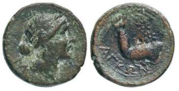 | SNG ANS 109 | Ancona, Picenum. AE21. Ca 300-250 BC. Head of Aphrodite right; M behind / AΓKΩN, Right arm holding palm branch, two stars above the bicep. Rutter, HN 1; SNG ANS 109. | Text | Image |