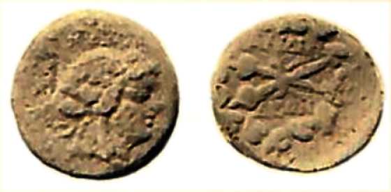 | Aulock Pisidia 172 | Andeda, Pisidia, AE16, civic issue, 100-1 BC. Head of Dionysos right, wreathed with ivy. / ANΔH-ΔEΩN, crossed thyrsoi in wreath. Aulock Pisidien 1, 172; Loebbecke p 326 and pl. XIII,10 in ZfN 1885. | Text | Image |