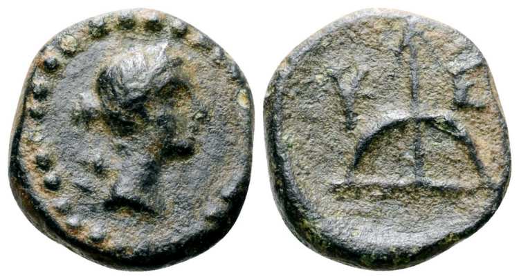 | Aulock Pisis. II 760 | Keraitai, Pisidia. AE15. 40-32 BC. 2.19 g. Shield decorated with a caduceus. / KEΡA, boar's head right. Aulock Pisidien II 760; Paris 299B; SNG France 3, 1422 corr (caduceus faint and omitted); SNG Turkey 6.1, 1386-1388. | Text | Image |