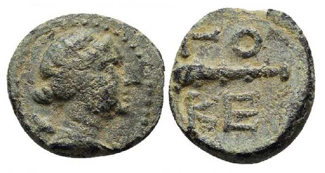 | SNG vA 5055 | Keraitai, Pisidia. AE 13.9mm, 2.6 g. ca 70-40 BC. Laureate head of Artemis right, quiver behind shoulder / KE-TO downwards to left and right, club.SNG von Aulock 5055; Aulock Pisidien II 731-737; Imhoof KM 3; Paris 300; SNG France 3, 1421; Waddington 3663; SNG Cop 117; SNG Turkey 6.1, 1294. | Text | Image |