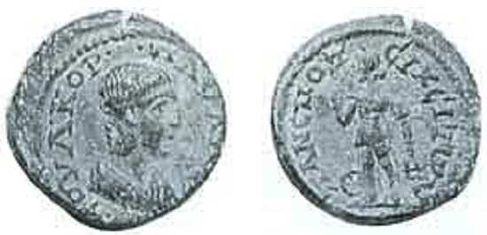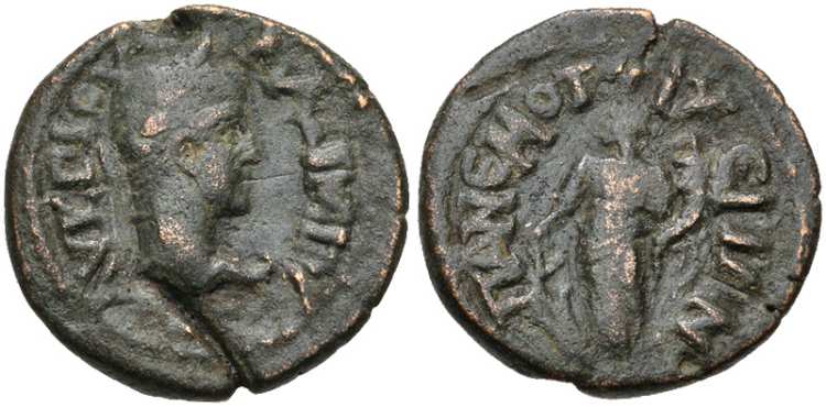 | wwxls 44634 | Julia Paula, AE19 of Panemoteichos, Pisidia. AD 219-220. IOYΛ KOΡ ΠAYΛA, draped bust right. / ΠANEMOTEIXEITΩN, Tyche standing left, holding rudder and cornucopiae. Unpublished. wwxls 44634. | Text | Image |